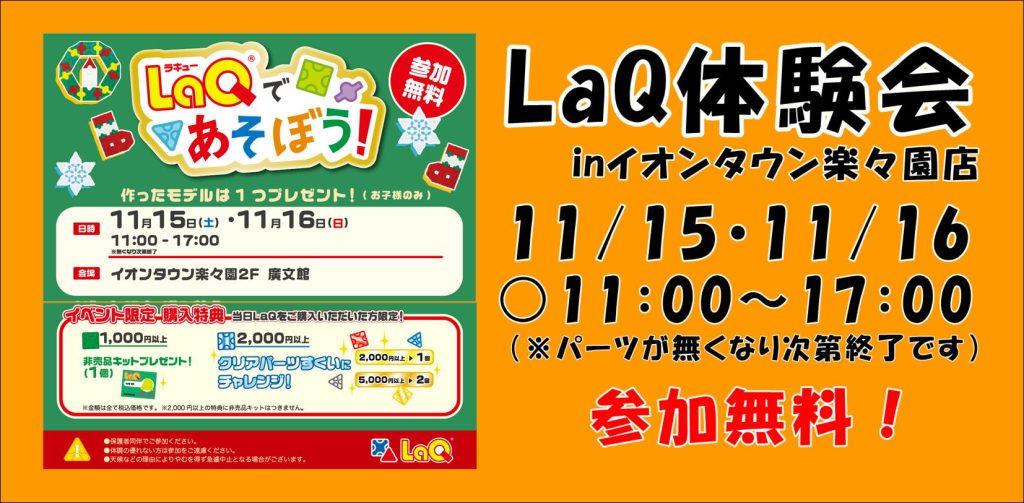 いっしょにLaQをつくってみよう!参加費は無料です。
